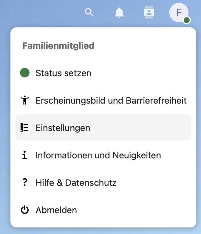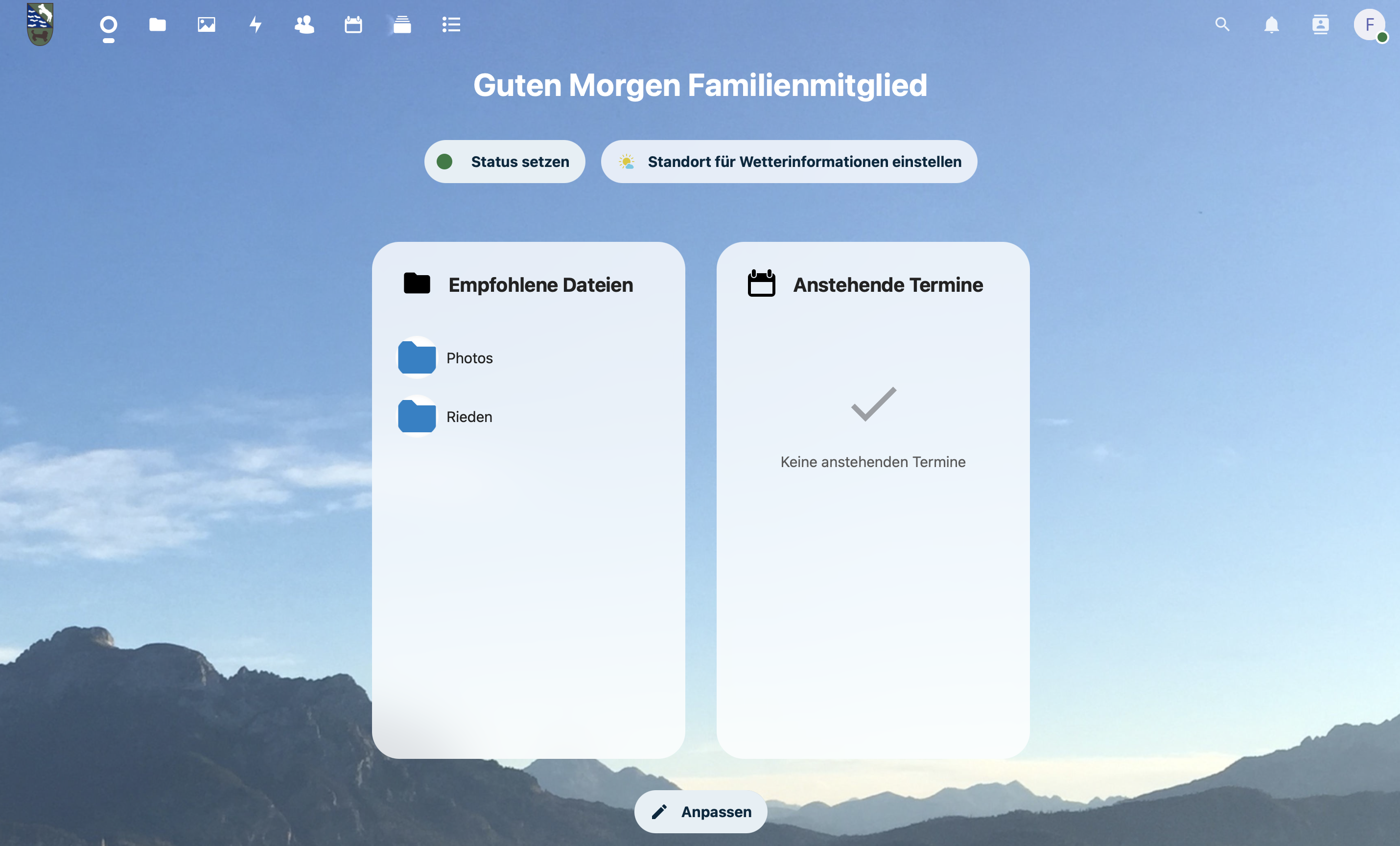 Nach Beenden der Infos hast Du Blick auf das Dashboard. Hier gibt es nichts Wichtiges zu tun, es sei denn, Du möchtest Deinen Anwesenheitsstatus oder Deinen Ort für die Wettervorhersage setzen.