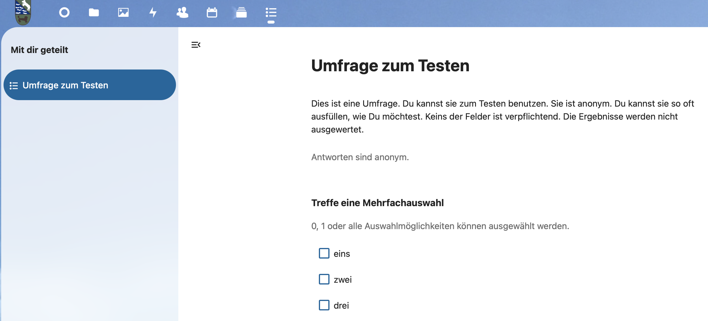 Umfragen zu verschiednen Themen. Eine zum Testen ist schon da :)